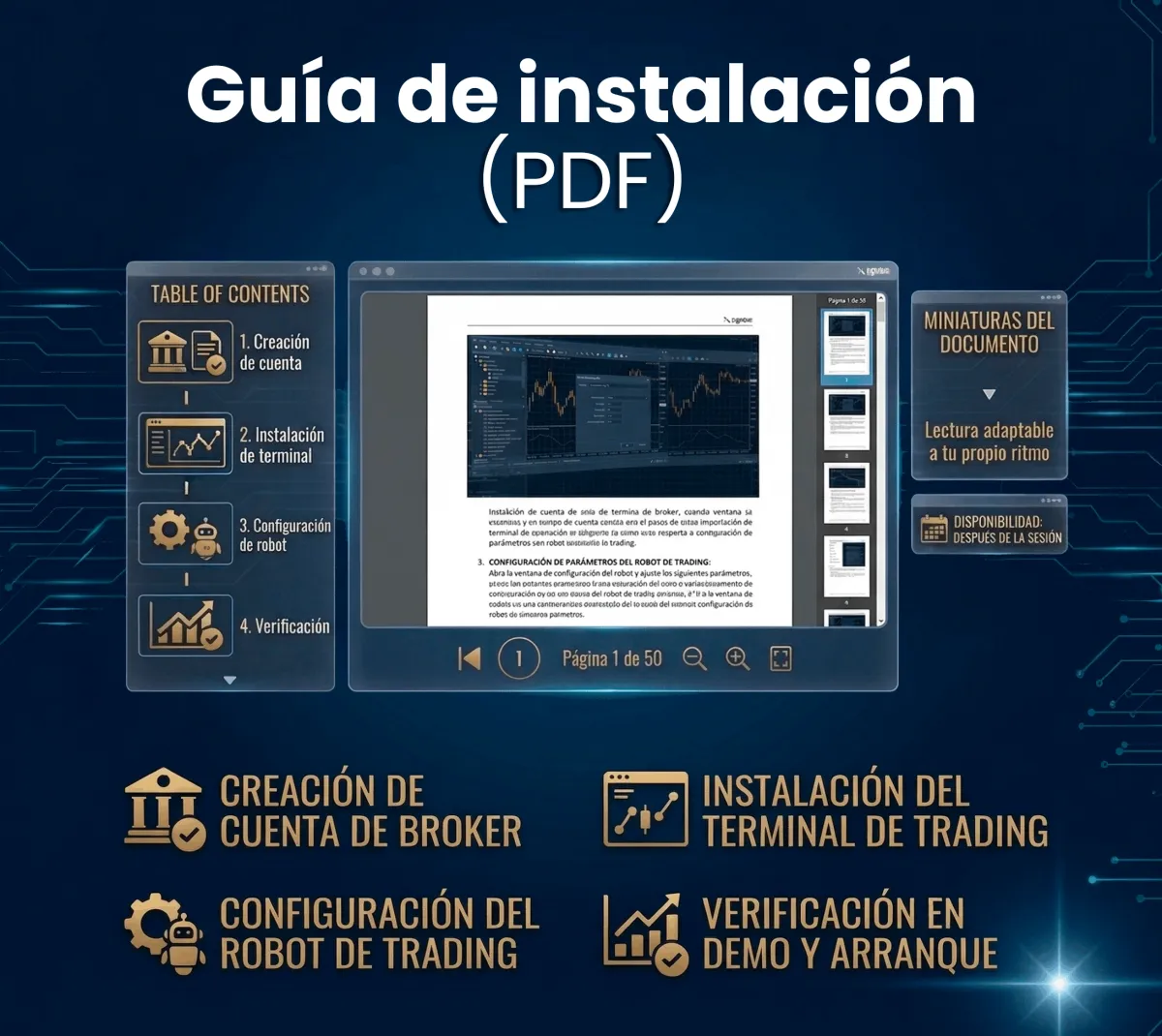 Los 4 pilares del sistema: Una cuenta donde se mueve tu dinero, un ordenador que nunca se apaga (aunque tú te vayas a dormir), un programa que analiza el mercado, y el robot que toma las decisiones por ti. En la masterclass montas los 4 paso a paso.