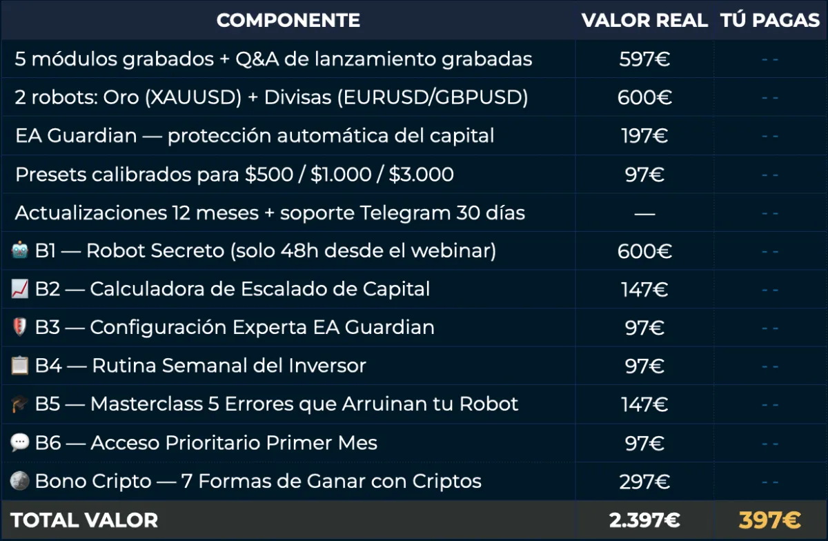 Documento exclusivo (30 páginas) donde Jaime muestra su portfolio personal actual: qué 8 robots tiene activos, en qué pares, con qué lotaje según su capital, y cómo los combina para que cuando uno tiene drawdown los otros compensen.